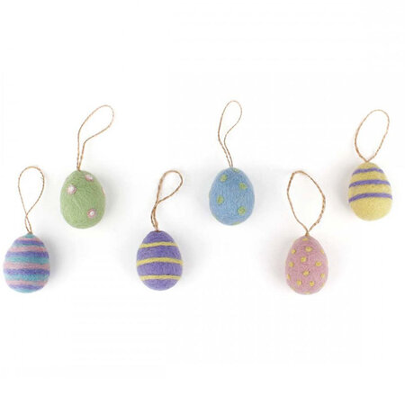 Vilten ei met margrietjes in pasteltinten (blauw, geel, groen, turquoise, lila en roze) met een touwtje eraan om op te hangen.